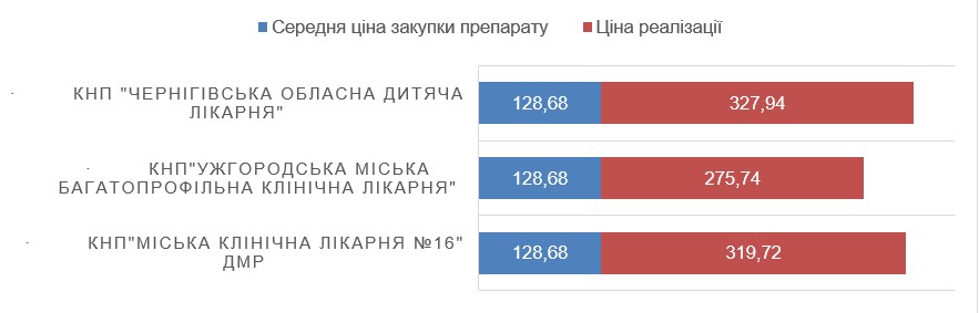При чому на інфографіці зображено середньо-зважене значення щодо завищення ін. У деяких випадках націнки перевищують 150%, зокрема на цефазолін, який деякі лікарні купували по 327 грн при середній закупівельній ціні близько 128 грн.